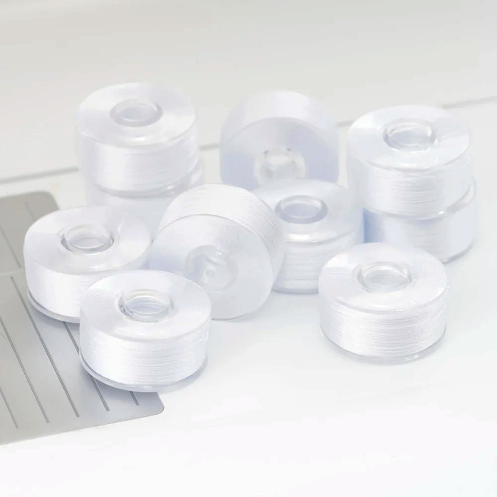 Enjoy smooth, worry-free stitching with the PFAFF 10pk Prewound Embroidery Bobbins. Pre-filled with premium, high-tenacity polyester thread, these bob