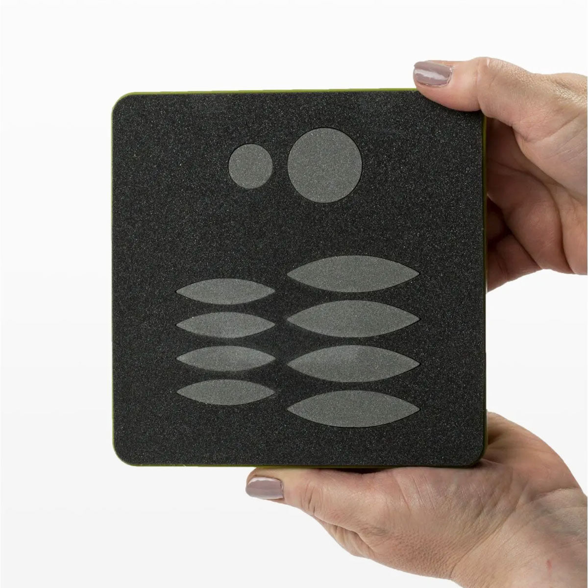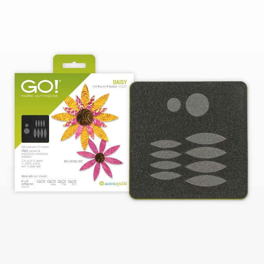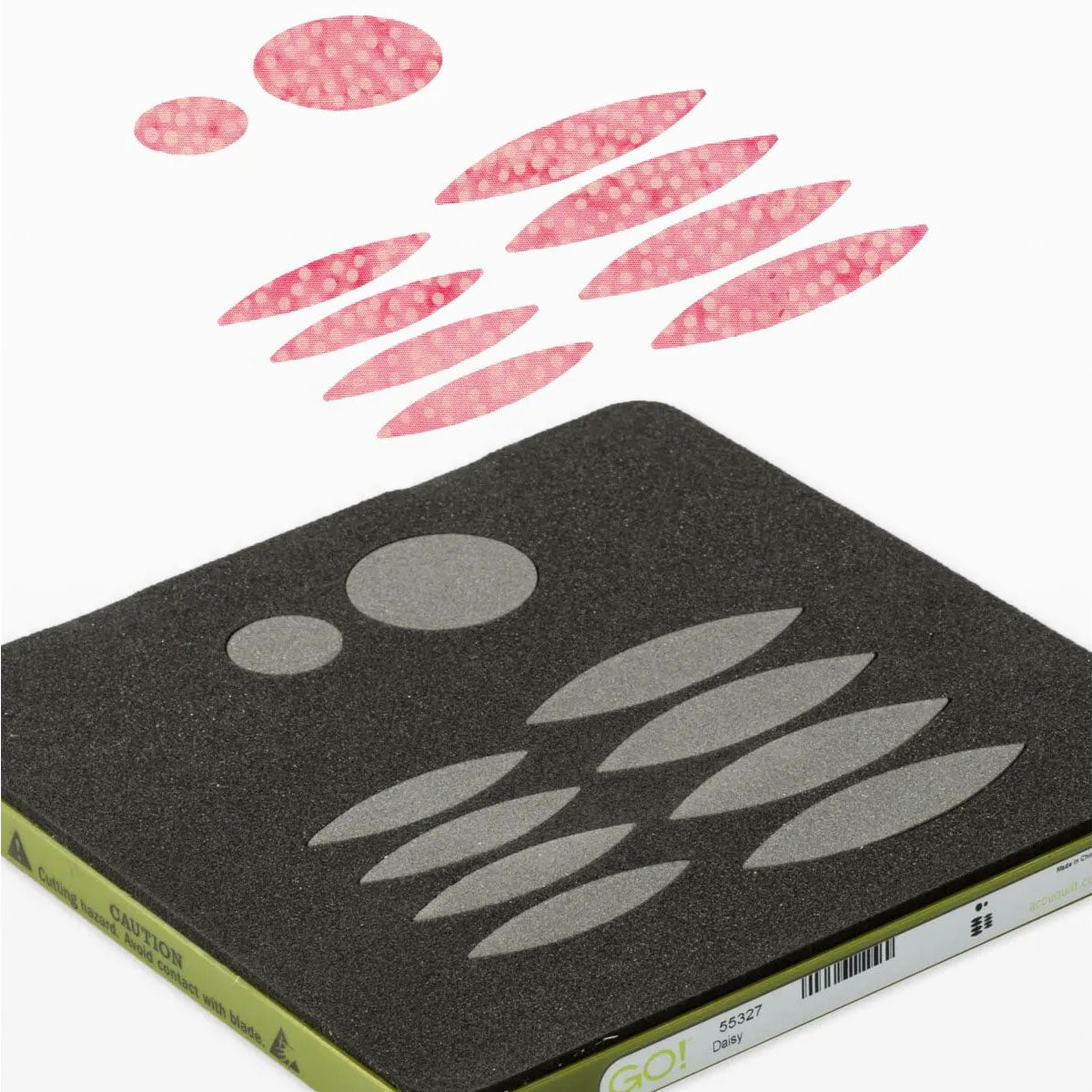The Accuquilt GO! Daisy Die simultaneously cuts four large petals, four small petals, and two centers. The individually cut pieces allow you to arrang