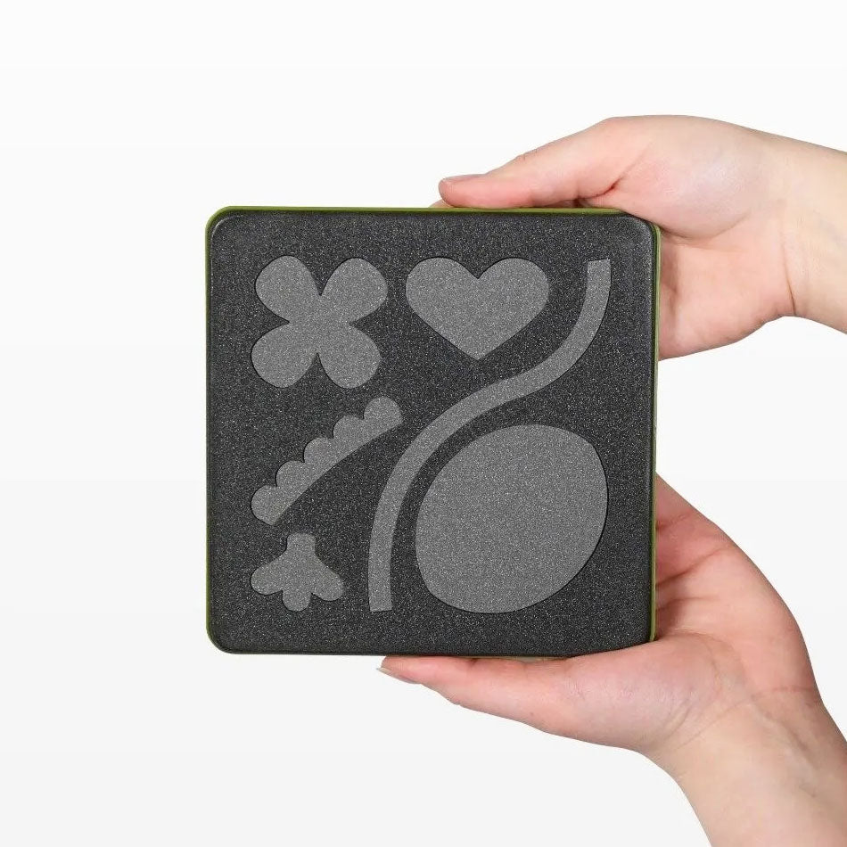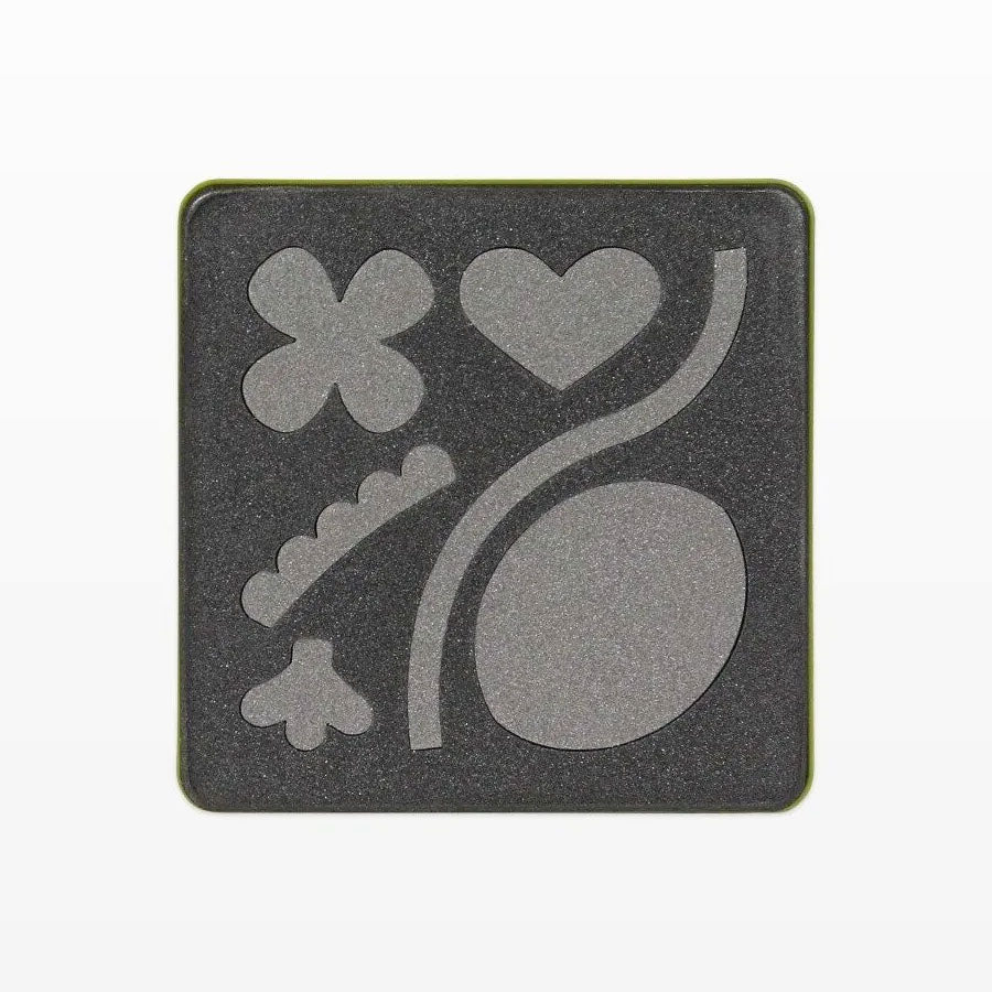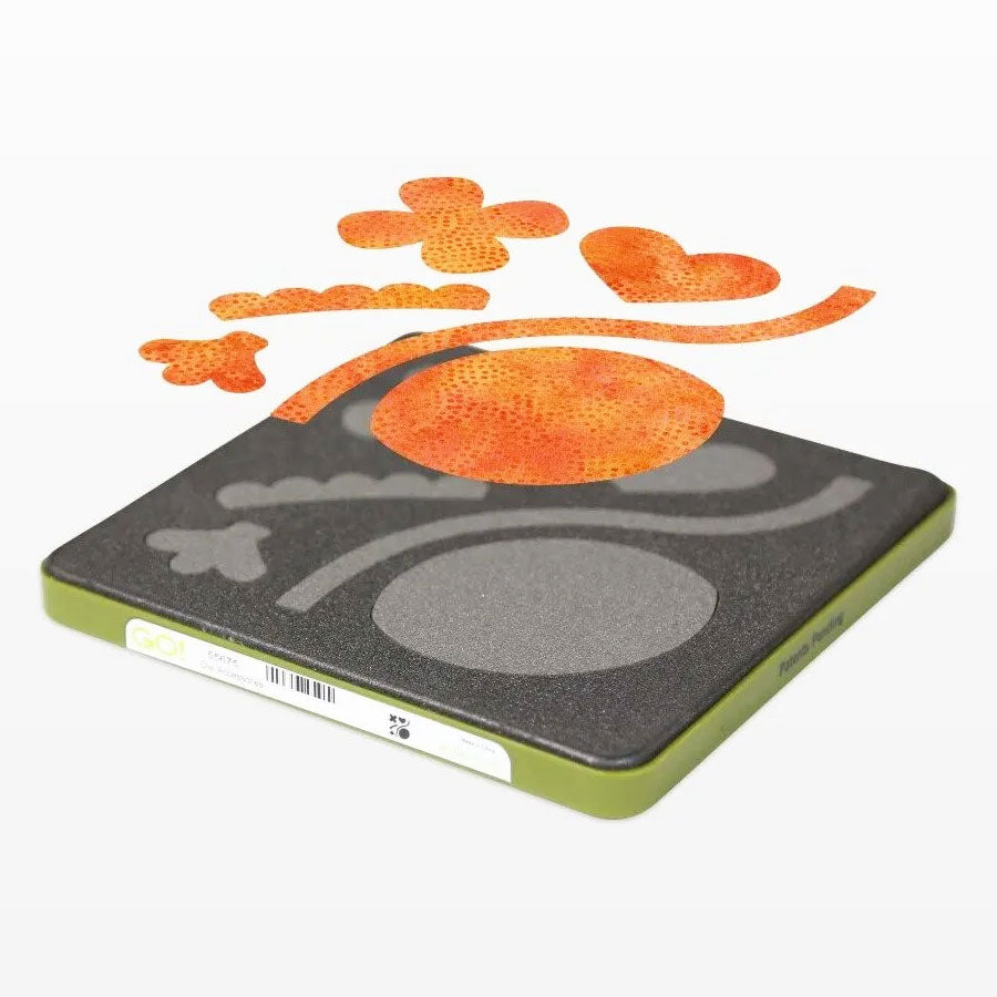 The Accuquilt GO! Owl Accessories Die features six shapes: feather, flower, foot/antler, heart, stem, and base. This die is intended to be used with t