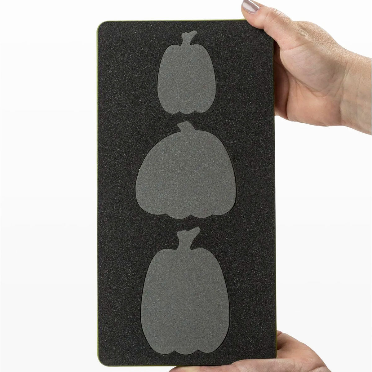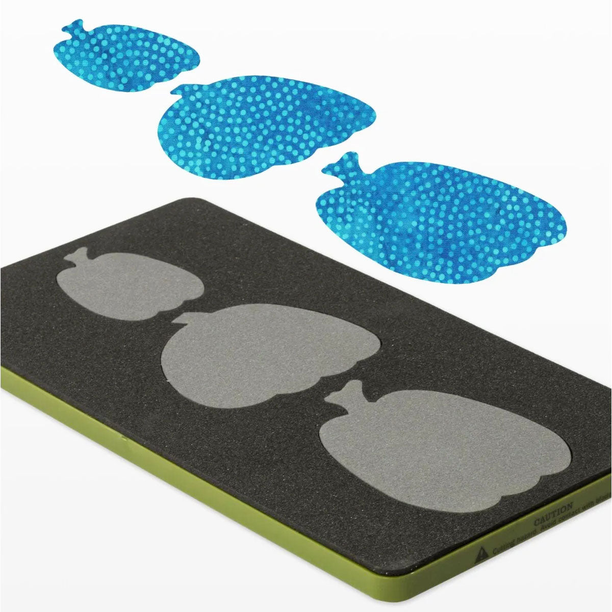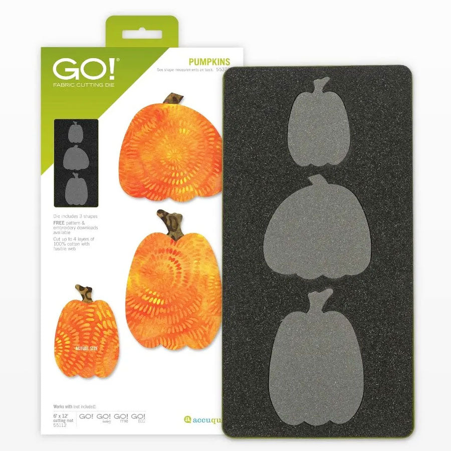 The Accuquilt GO! Pumpkins Die features three different style pumpkins perfect for quilts, Fall/Halloween-themed home decor, placemats, table runners,
