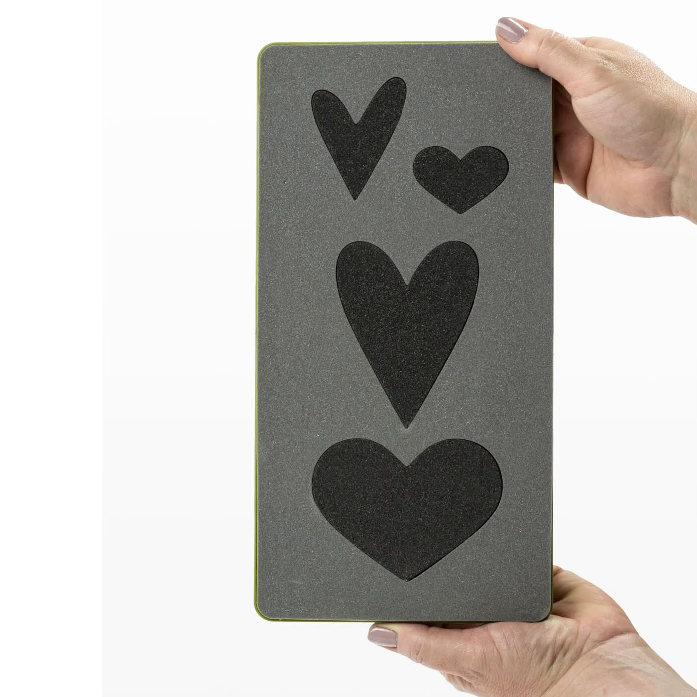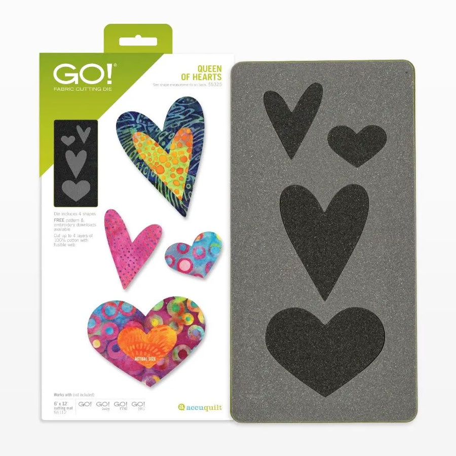 The Accuquilt GO! Queen of Hearts Die features four trendy hearts that go great with everything! Perfect for Valentine-themed projects, baby gifts, qu