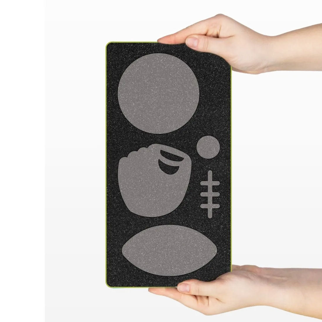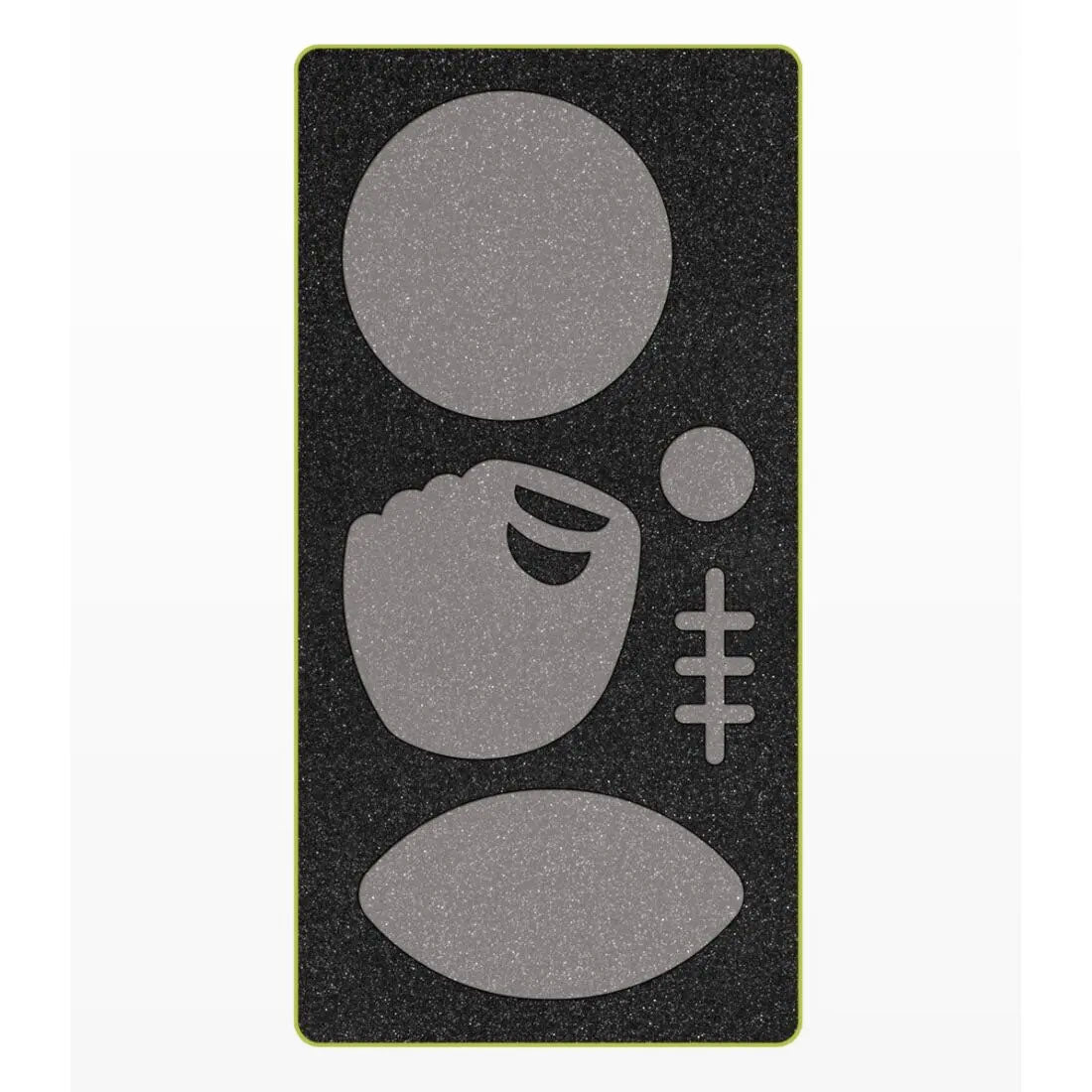 The Accuquilt GO! Sports Medley Die features a baseball and mitt, a football, and a basketball/soccer ball that is perfect for sports-themed projects