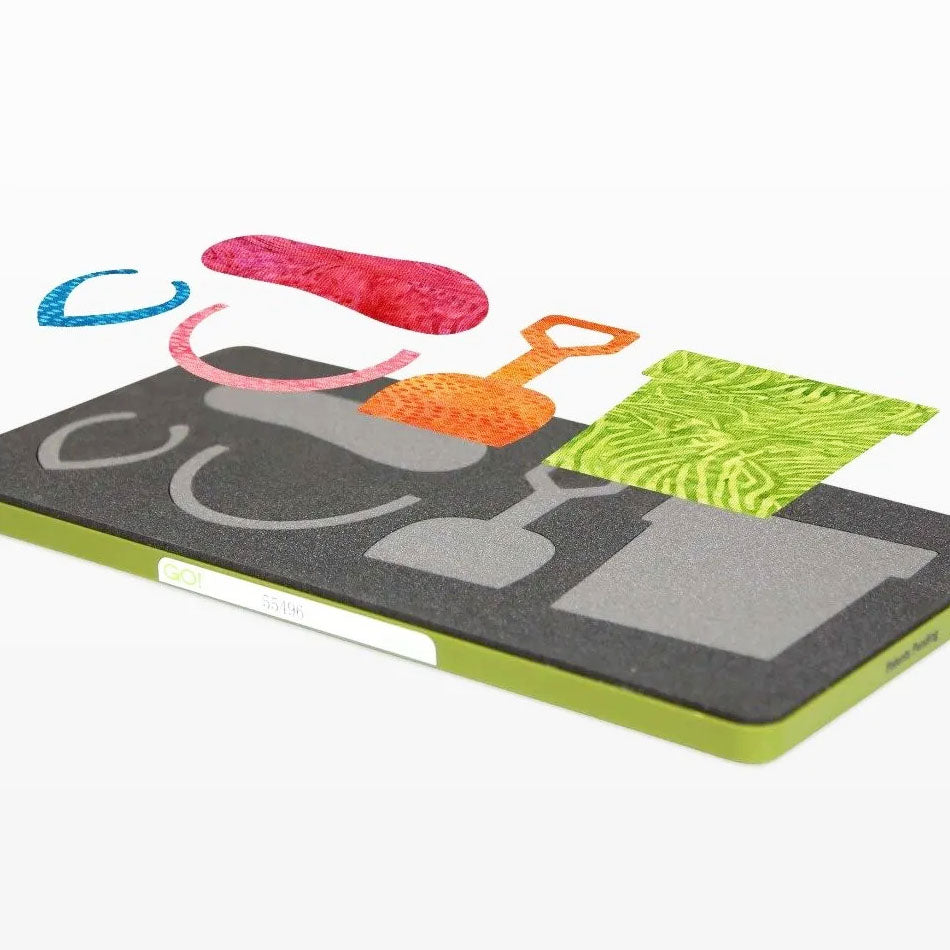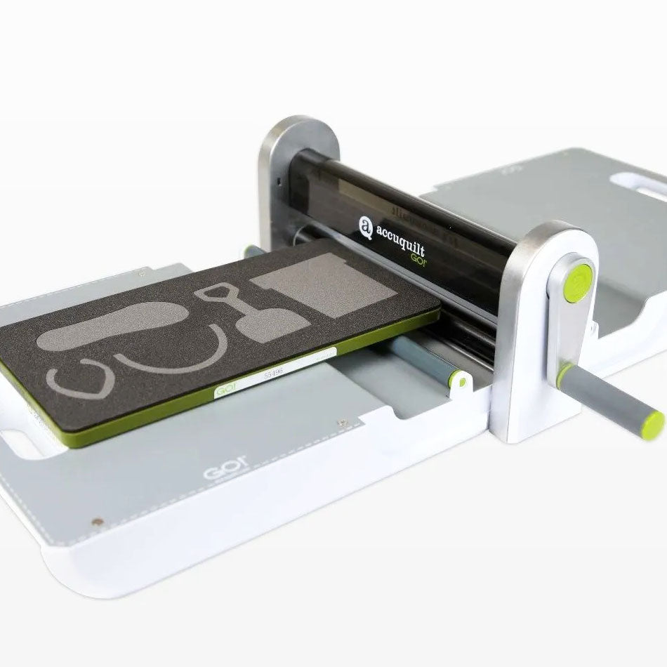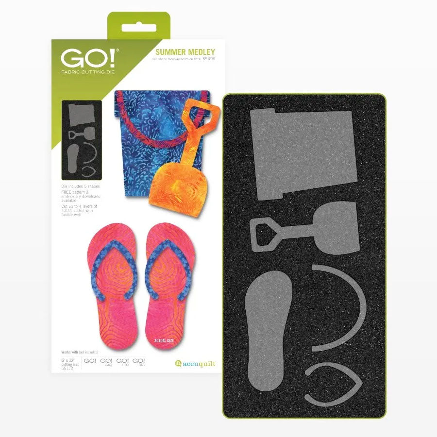 The Accuquilt GO! Summer Medley Die features flip-flops and a bucket with a shovel, all cut with one pass through an Accuquilt Fabric Cutter! Pair up
