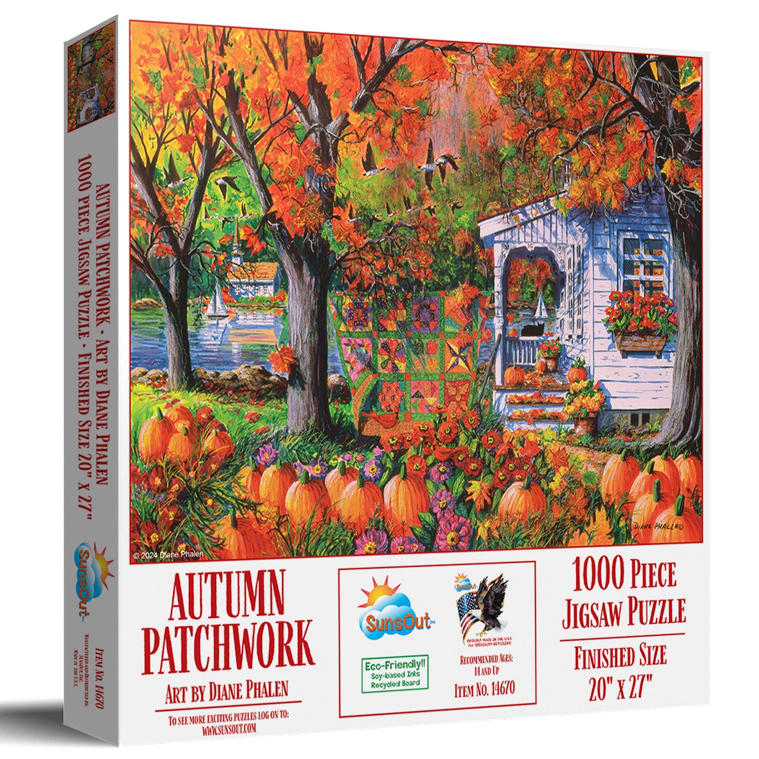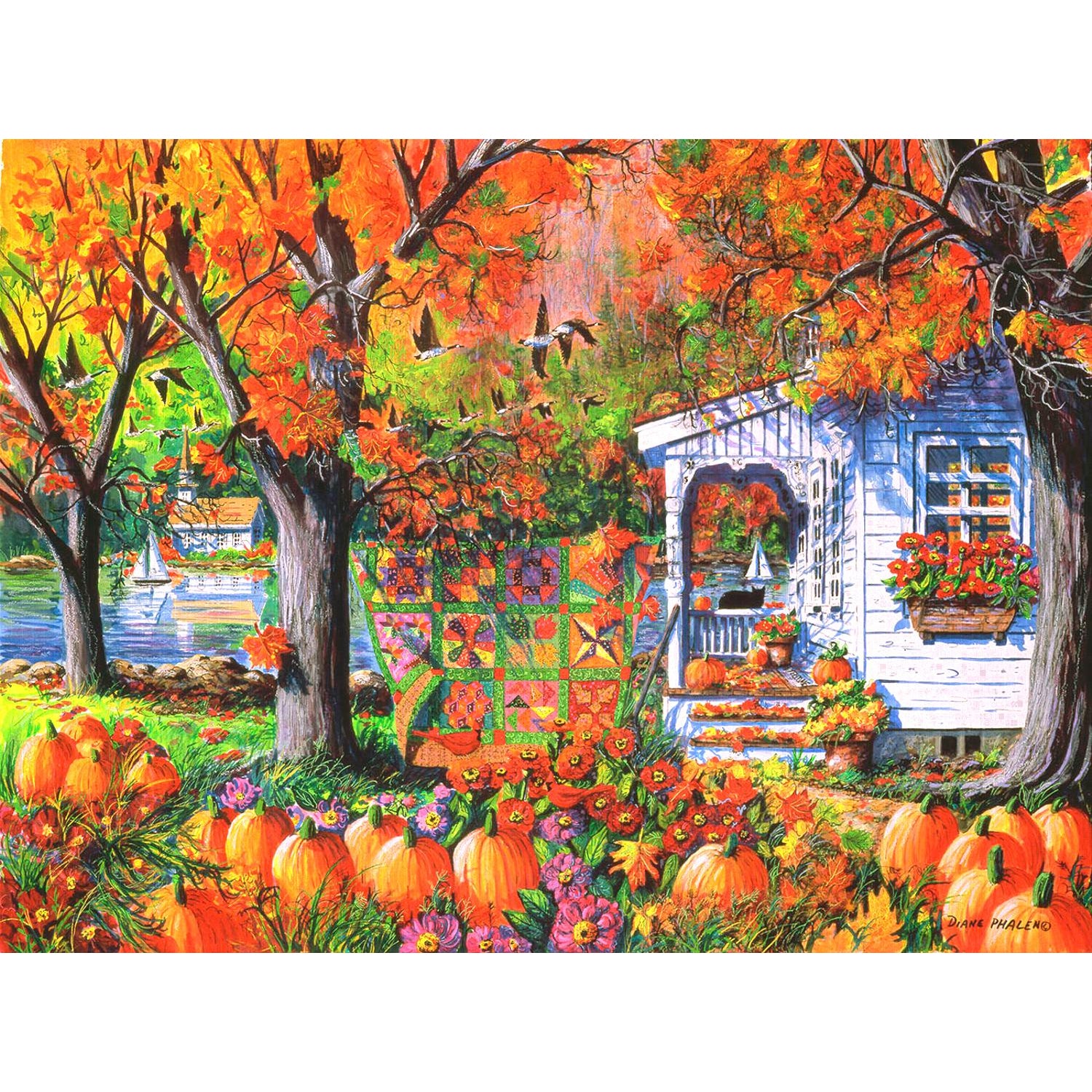 Celebrate the vibrant beauty of fall with the SunsOut Autumn Patchwork 1000-Piece Jigsaw Puzzle, featuring the stunning artistry of Diane Phalen. This