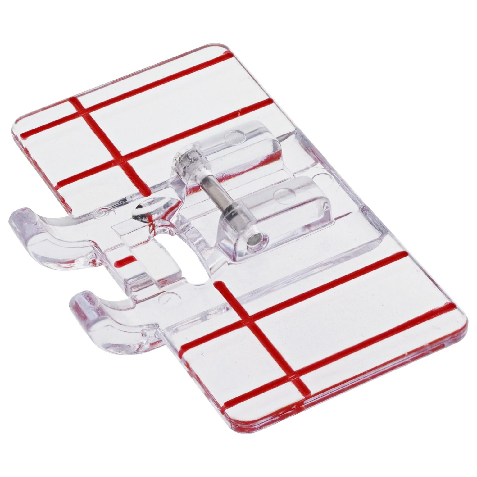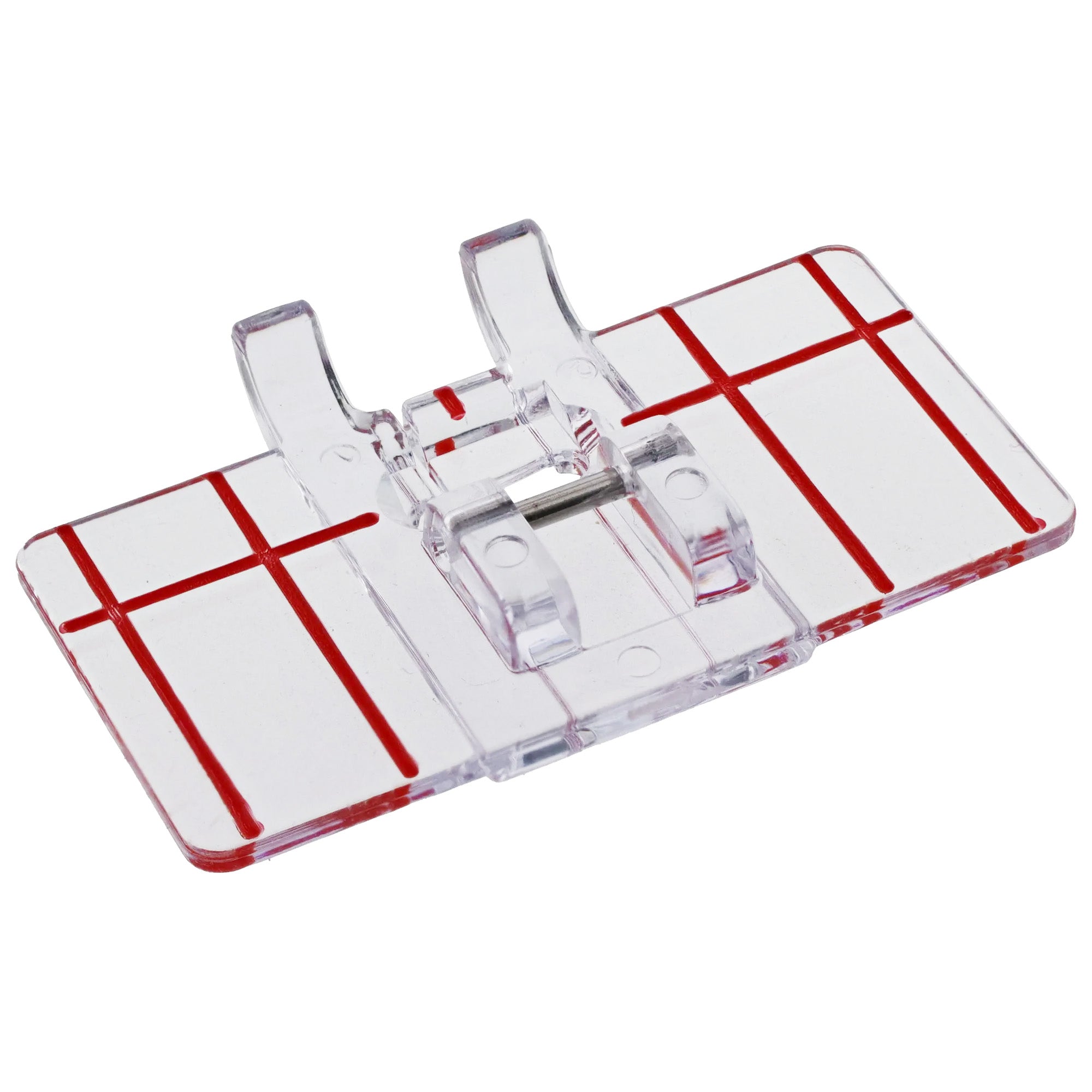 The Border Guide Foot is helpful for quickly matching up border designs. With the red lines and marks on the foot, there is no need to mark to sew any