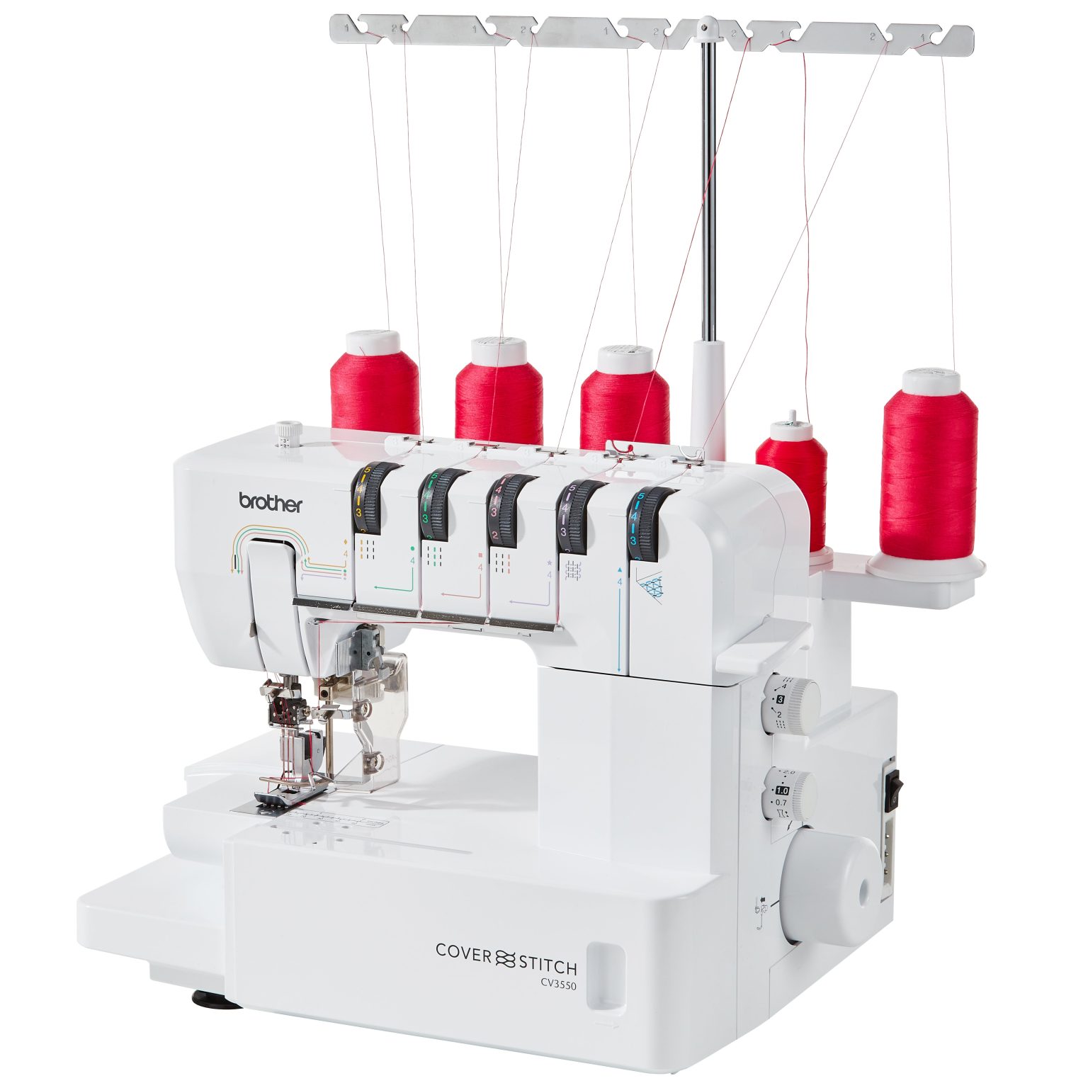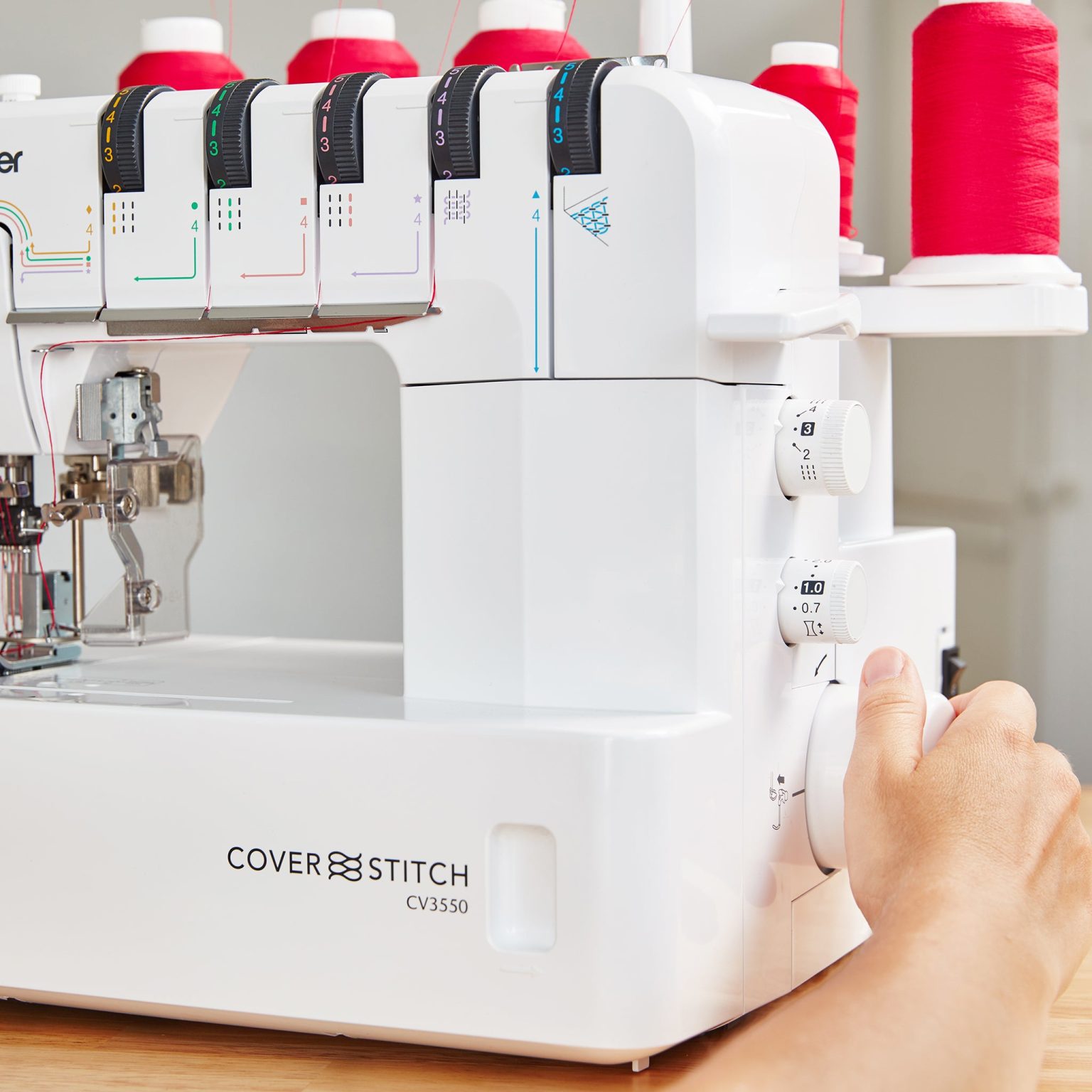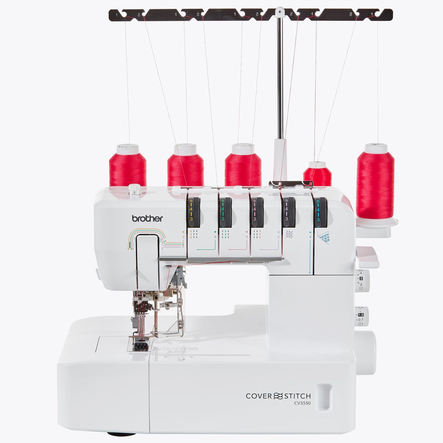 The Brother CV3550 Double-Sided Cover Stitch Machine uses 5, 4, 3, or 2 threads and is designed to handle a variety of fabrics and applications, offer