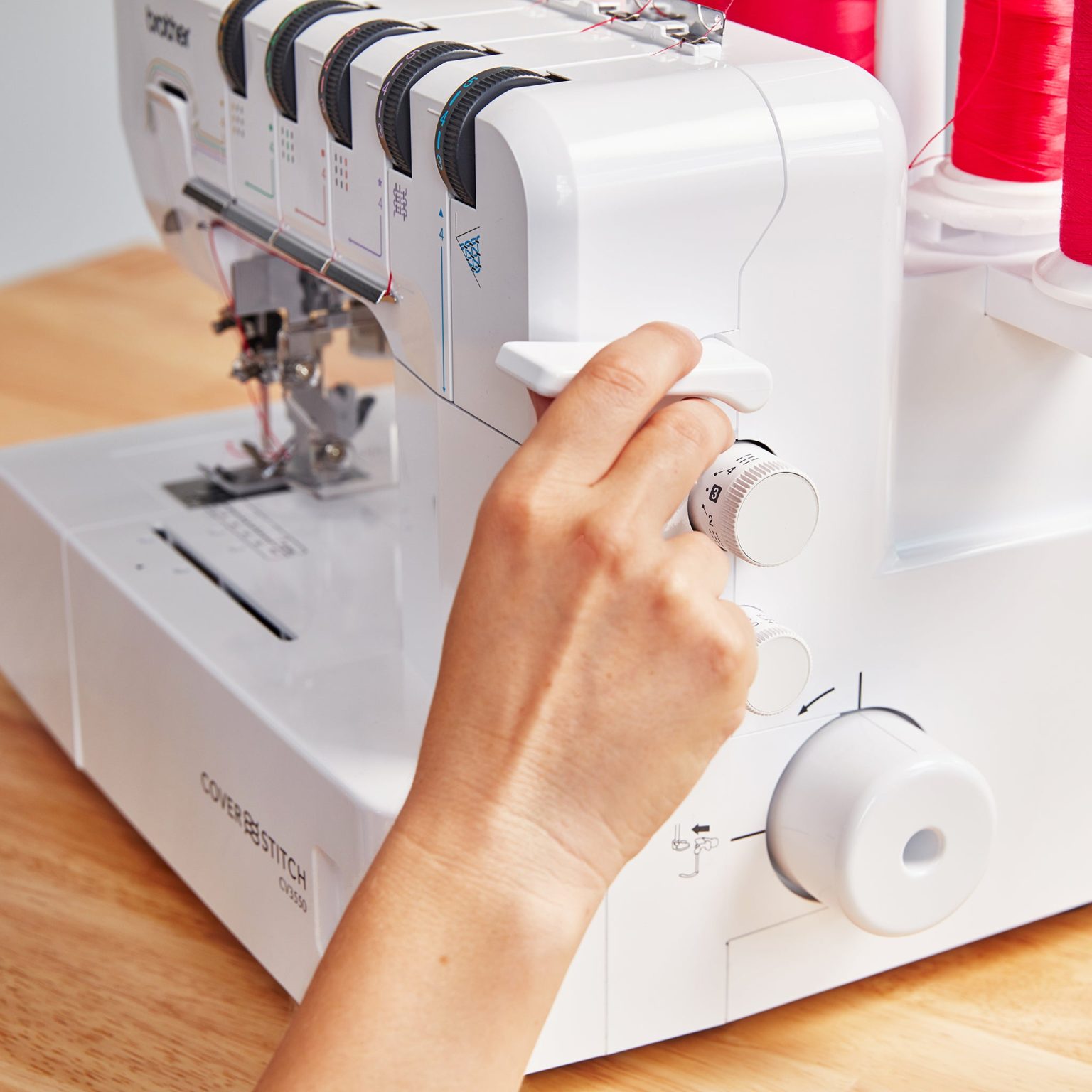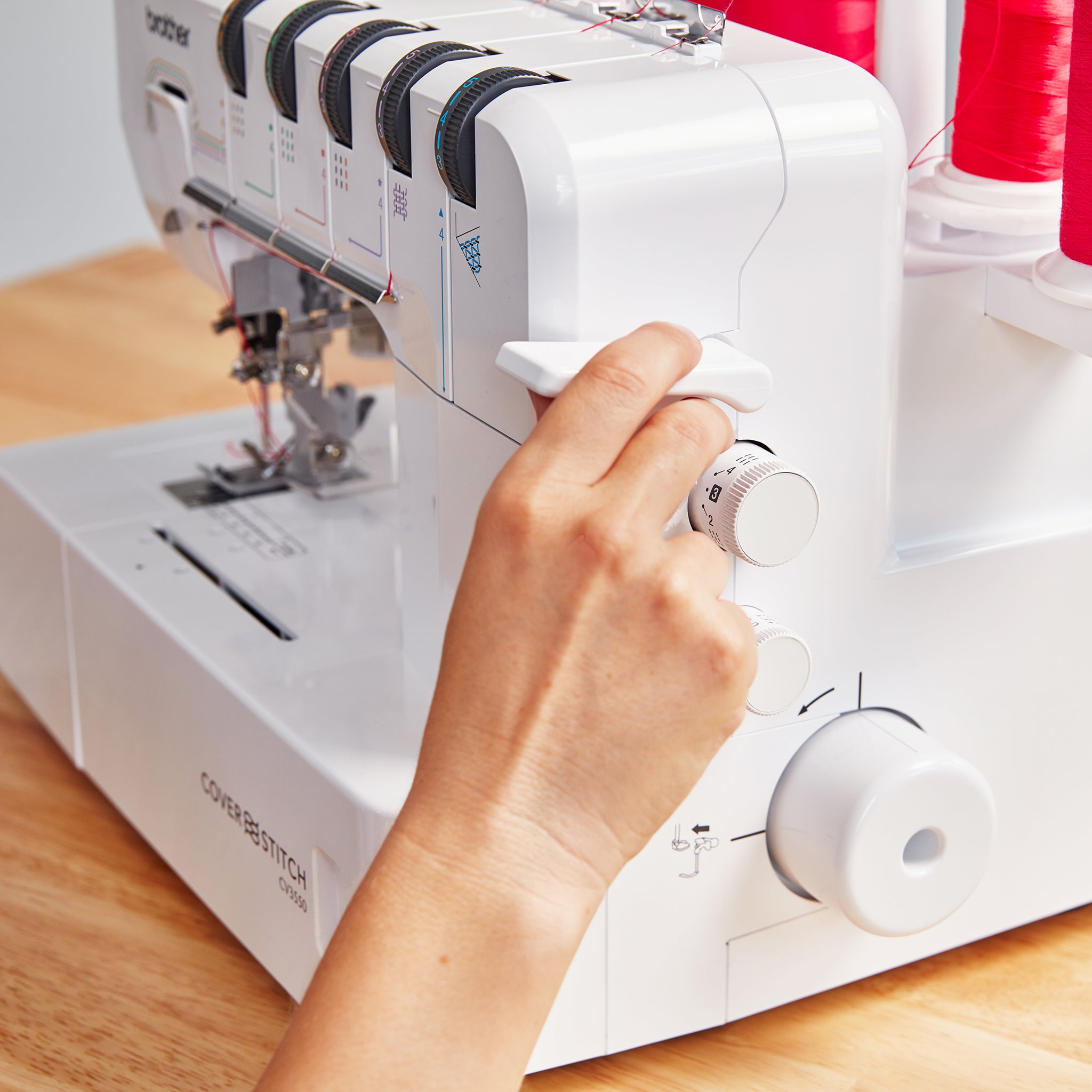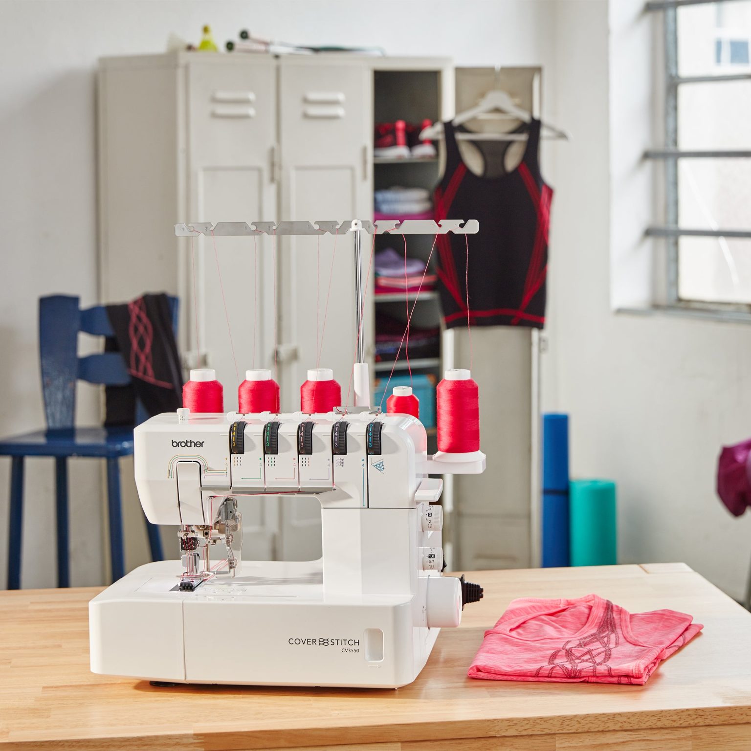 The Brother CV3550 Double-Sided Cover Stitch Machine uses 5, 4, 3, or 2 threads and is designed to handle a variety of fabrics and applications, offer
