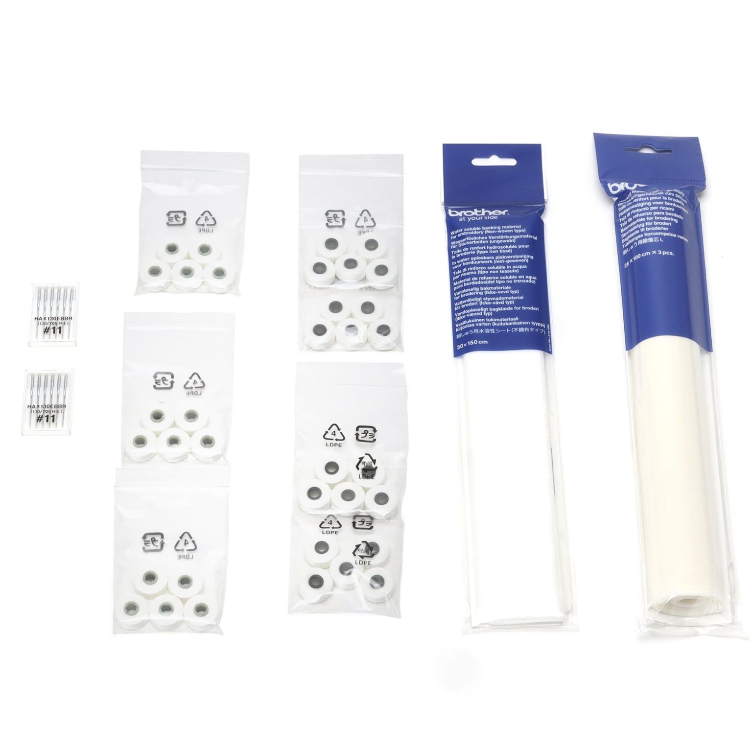 Essential embroidery accessories in one convenient bundle—this Brother Entrepreneur Consumables Kit includes stabilizers, bobbins, and needles tailore