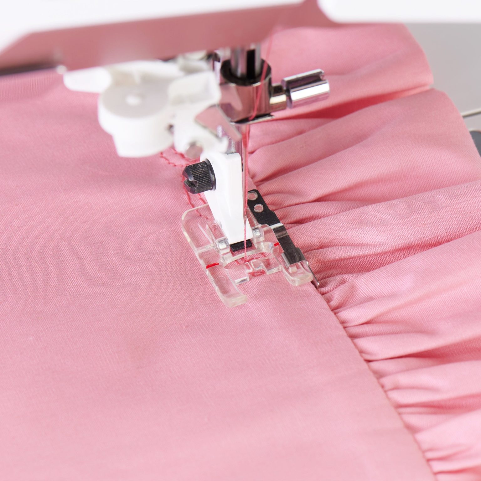 The Clear B Edge Stitching Foot ensures precise decorative stitching along fabric edges with ease. The tunnel on the underside allows stitches to form