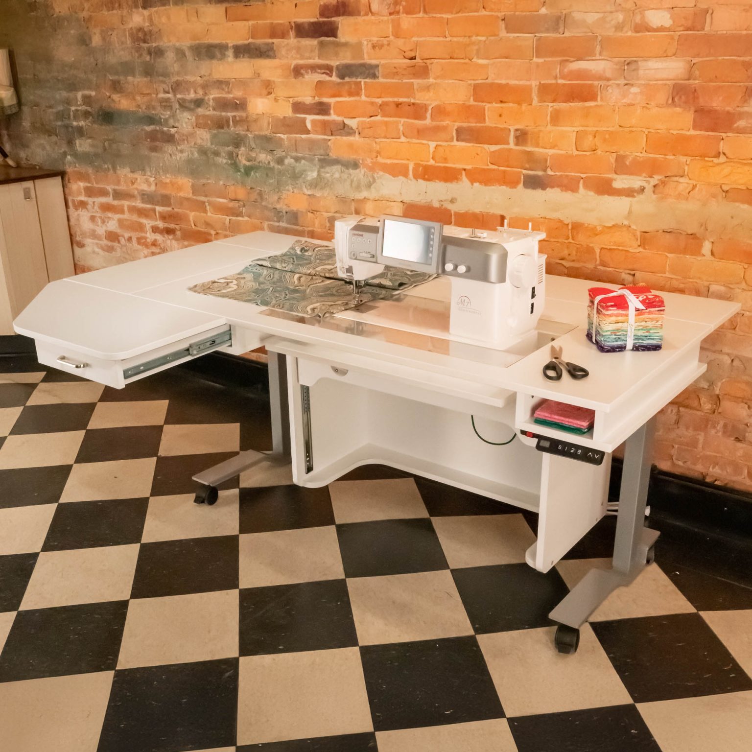 Sew in comfort with the Horn of America New Heights Adjustable Table, designed to move with you. With an adjustable height range of 29