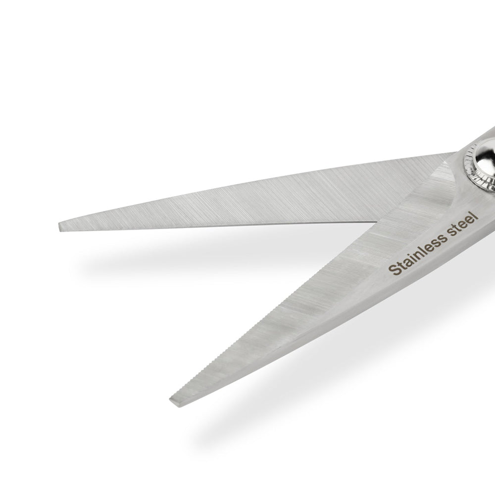 These scissors feature a comfortable soft-grip handle and micro-serrated blades that grip fabric fibers, prevent slippage, and guarantee straight cuts