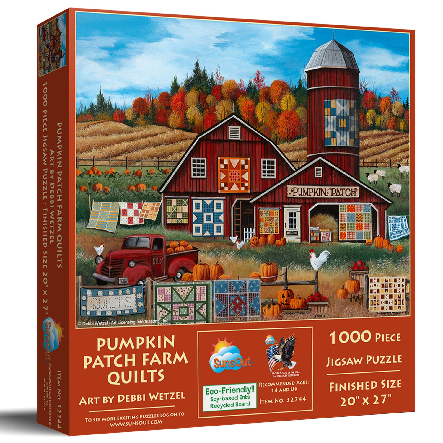Celebrate the charm of autumn with the SunsOut Pumpkin Patch Barn Quilts 1000-Piece Jigsaw Puzzle, featuring the delightful artistry of Debbi Wetzel.
