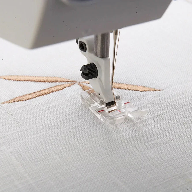 Perfect for satin stitch appliqué, taper stitches, and decorative stitching, the Transparent B Foot provides smooth feeding over stitches with its tun