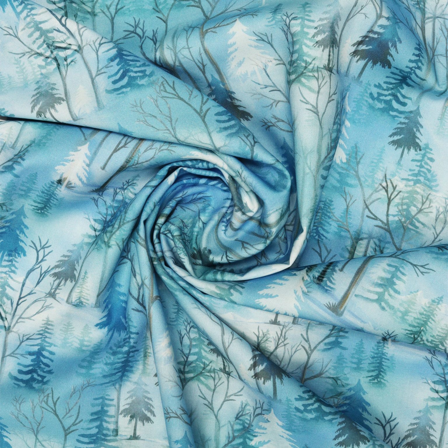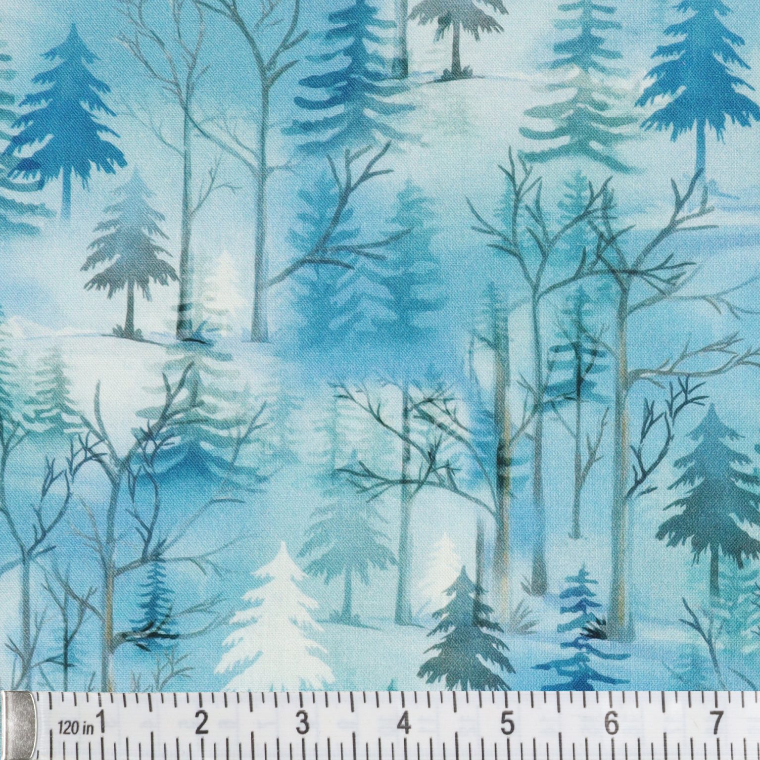 Wrap your projects in the tranquil stillness of winter with Pine Woodland Medium Blue. This scenic print captures a layered forest of snow-dusted ever