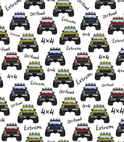 The Multi 4 x 4 Trucks Fabric is printed by Sew Creative Fabrics. It is digitally printed on 100% cotton and measures 42-45